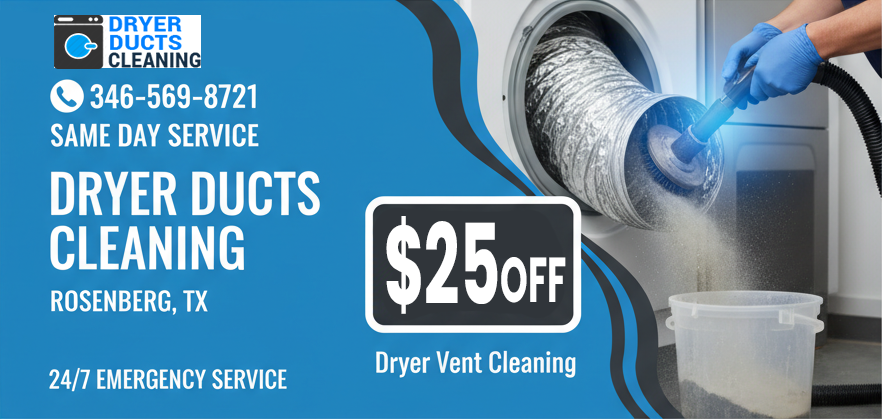 Our cleaning process not only improves efficiency but also restores a fresh, clean smell to your home. Contact Rosenberg. Dryer Duct Cleaning TX to get rid of these issues fast. We guarantee prompt service, honest pricing and lasting results.